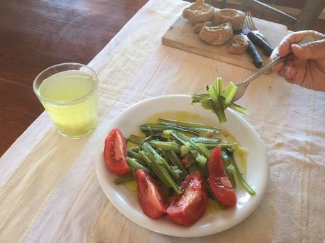 • Wild green salad (Βραστά χόρτα) or Sauted wild greens (Τσιγαριαστά χόρτα) or Cretan rusk salad (Ντάκος)