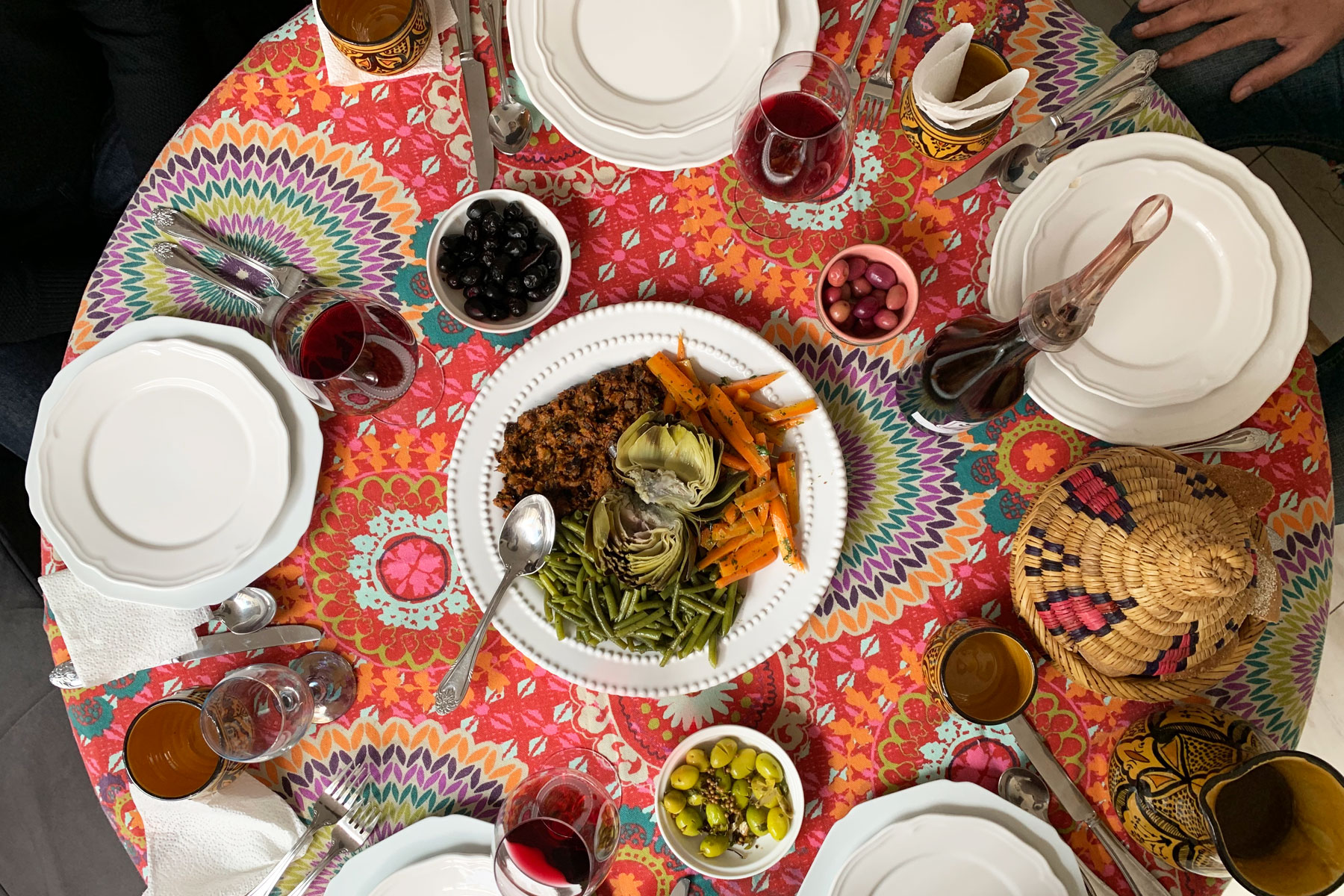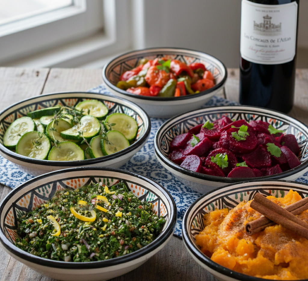 • Second Course: Warm Moroccan vegetable appetizers with olive oil and spices, paired with a light aromatic wine