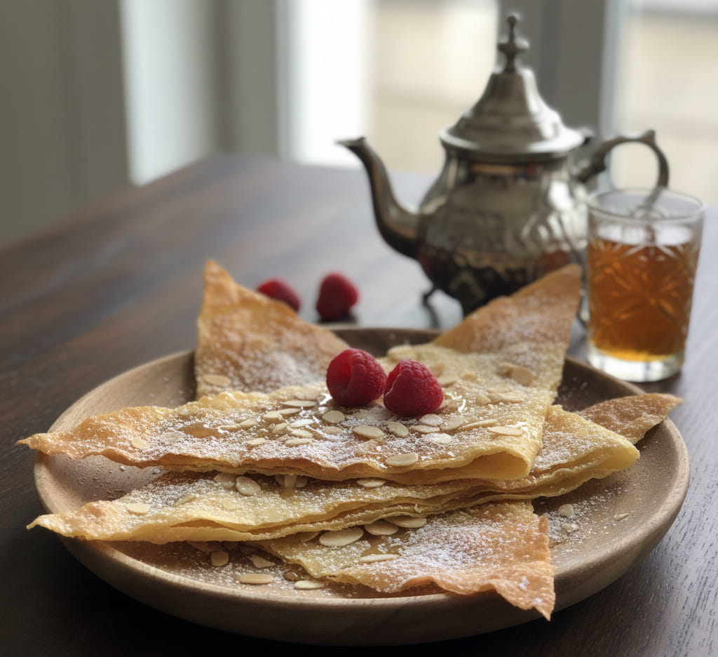 • Dessert: Crispy milk pastilla with almonds, honey, and orange blossom, served with Moroccan tea