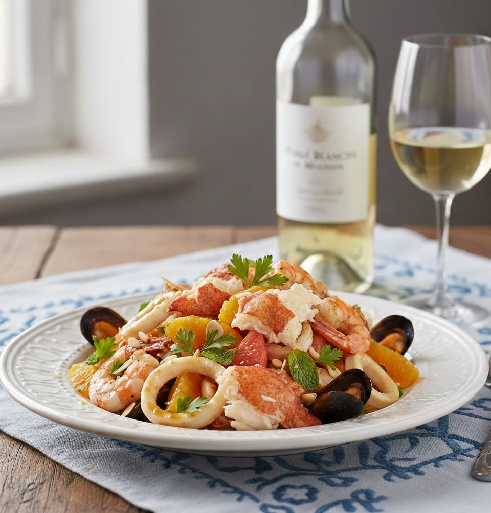 • First Course: Royal Atlantic seafood salad with Moroccan citrus dressing, paired with a fresh Moroccan white wine